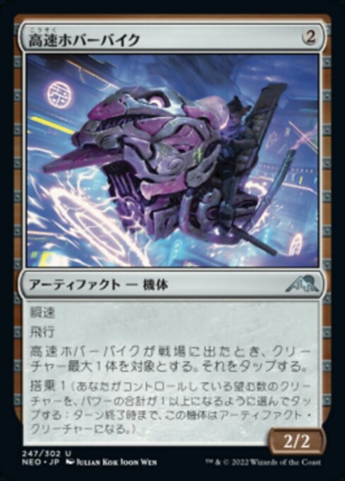 | Rules | Flash Flying When High-Speed Hoverbike enters the battlefield, tap up to one target creature. Crew 1 (Tap any number of creatures you control with total power 1 or more: This Vehicle becomes an artifact creature until end of turn.) |