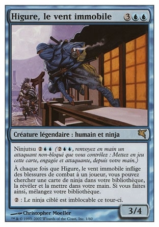 | Rules | Ninjutsu (, Return an unblocked attacker you control to hand: Put this card onto the battlefield from your hand tapped and attacking.) Whenever Higure, the Still Wind deals combat damage to a player, you may search your library for a Ninja card, reveal it, put it into your hand, then shuffle. : Target Ninja creature can't be blocked this turn. |