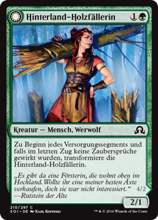 | Rules | At the beginning of each upkeep, if no spells were cast last turn, transform Hinterland Logger. // Trample At the beginning of each upkeep, if a player cast two or more spells last turn, transform Timber Shredder. |