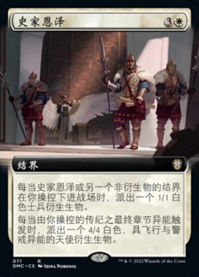 | Rules | Whenever Historian's Boon or another nontoken enchantment enters the battlefield under your control, create a 1/1 white Soldier creature token. Whenever the final chapter of a Saga you control triggers, create a 4/4 white Angel creature token with flying and vigilance. |