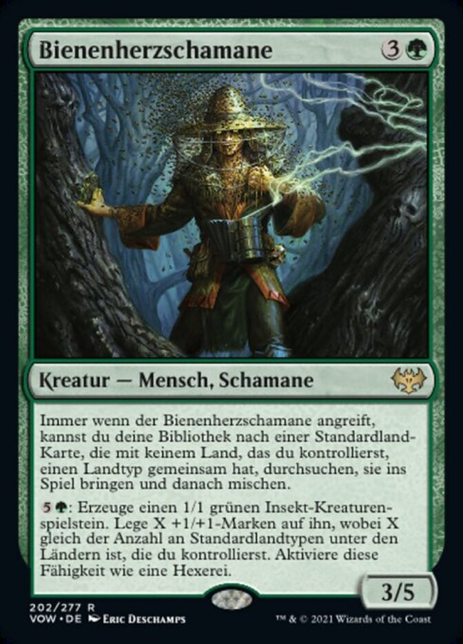 | Rules | Whenever Hiveheart Shaman attacks, you may search your library for a basic land card that doesn't share a land type with a land you control, put that card onto the battlefield, then shuffle. : Create a 1/1 green Insect creature token. Put X +1/+1 counters on it, where X is the number of basic land types among lands you control. Activate only as a sorcery. |