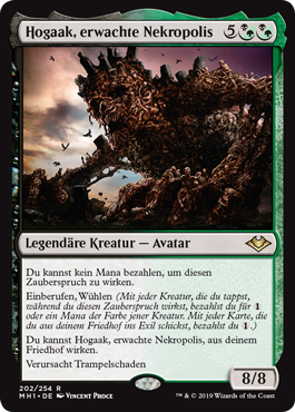 | Rules | You can't spend mana to cast this spell. Convoke, delve (Each creature you tap while casting this spell pays for or one mana of that creature's color. Each card you exile from your graveyard pays for .) You may cast Hogaak, Arisen Necropolis from your graveyard. Trample |