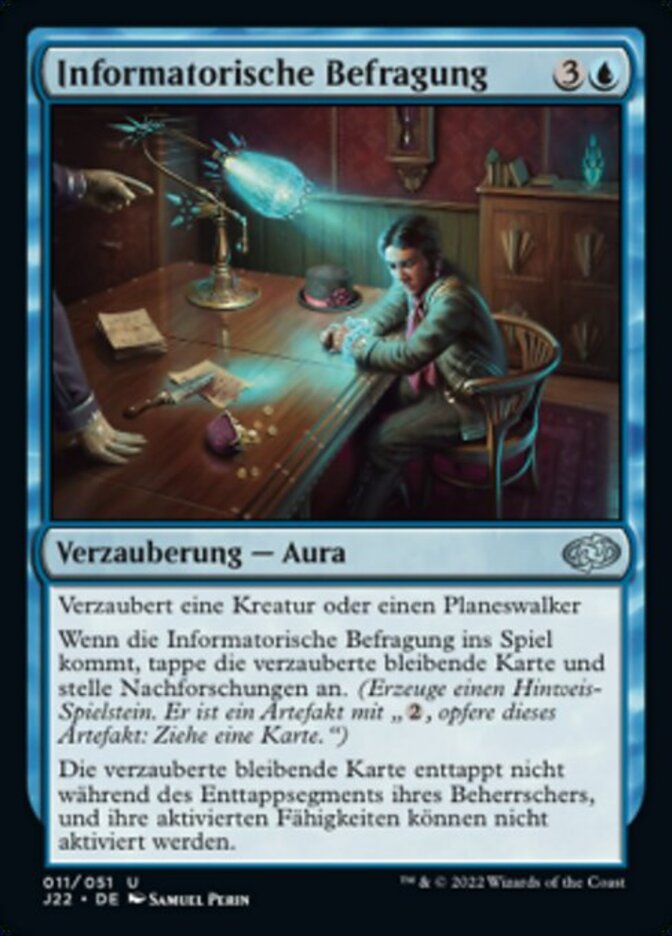 | Rules | Enchant creature or planeswalker When Hold for Questioning enters the battlefield, tap enchanted permanent and investigate. (Create a Clue token. It's an artifact with ", Sacrifice this artifact: Draw a card.") Enchanted permanent doesn't untap during its controller's untap step and its activated abilities can't be activated. |