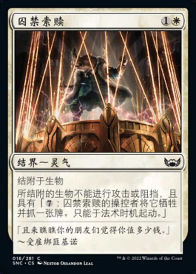 | Rules | Enchant creature Enchanted creature can't attack or block and has ": Hold for Ransom's controller sacrifices it and draws a card. Activate only as a sorcery." |