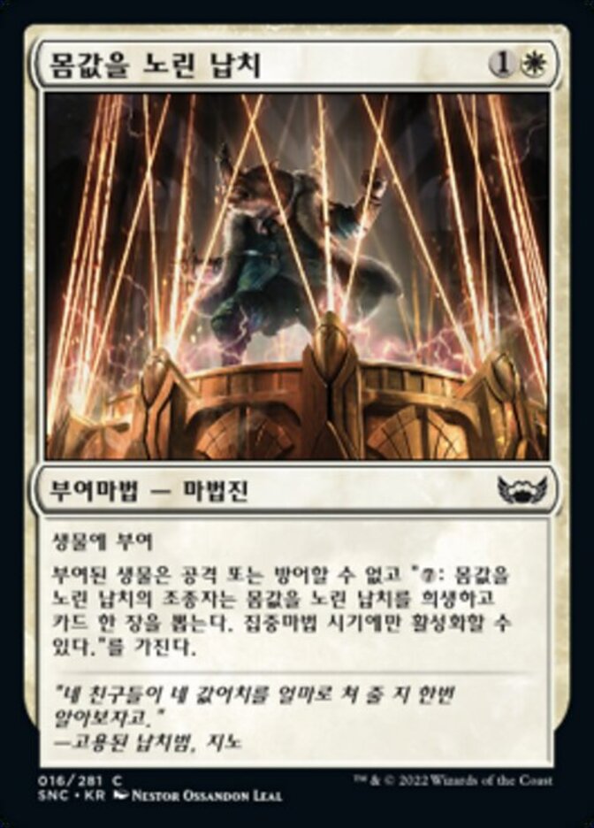 | Rules | Enchant creature Enchanted creature can't attack or block and has ": Hold for Ransom's controller sacrifices it and draws a card. Activate only as a sorcery." |