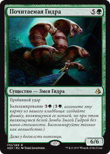 | Rules | Trample Embalm (, Exile this card from your graveyard: Create a token that's a copy of it, except it's a white Zombie Snake Hydra with no mana cost. Embalm only as a sorcery.) |