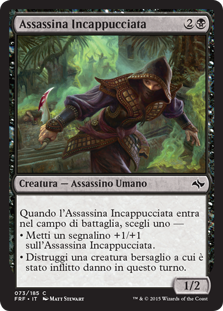 | Rules | When Hooded Assassin enters the battlefield, choose one — • Put a +1/+1 counter on Hooded Assassin. • Destroy target creature that was dealt damage this turn. |