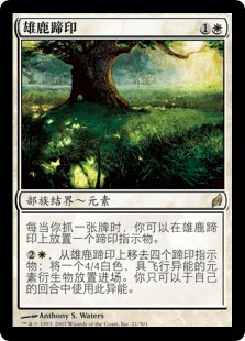 | Rules | Whenever you draw a card, you may put a hoofprint counter on Hoofprints of the Stag. , Remove four hoofprint counters from Hoofprints of the Stag: Create a 4/4 white Elemental creature token with flying. Activate only during your turn. |