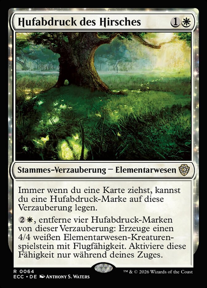 | Rules | Whenever you draw a card, you may put a hoofprint counter on Hoofprints of the Stag. , Remove four hoofprint counters from Hoofprints of the Stag: Create a 4/4 white Elemental creature token with flying. Activate only during your turn. |