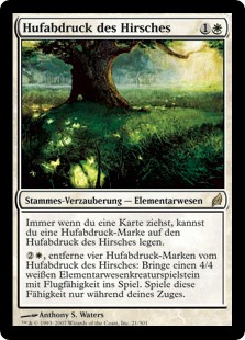 | Rules | Whenever you draw a card, you may put a hoofprint counter on Hoofprints of the Stag. , Remove four hoofprint counters from Hoofprints of the Stag: Create a 4/4 white Elemental creature token with flying. Activate only during your turn. |