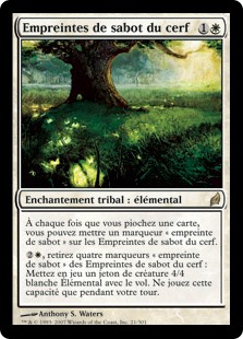 | Rules | Whenever you draw a card, you may put a hoofprint counter on Hoofprints of the Stag. , Remove four hoofprint counters from Hoofprints of the Stag: Create a 4/4 white Elemental creature token with flying. Activate only during your turn. |