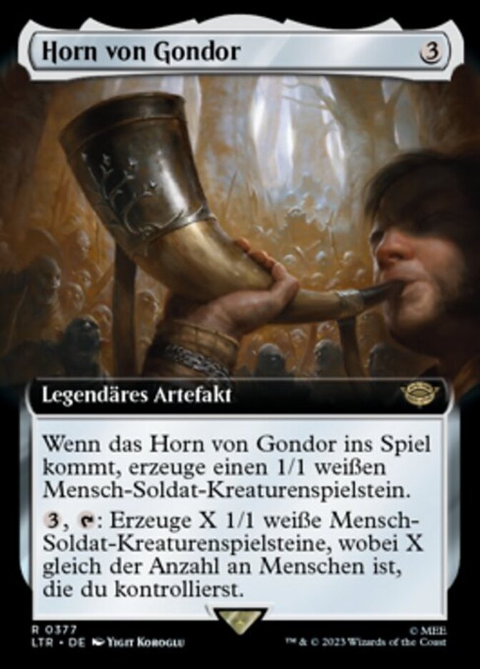 | Rules | When Horn of Gondor enters the battlefield, create a 1/1 white Human Soldier creature token. , : Create X 1/1 white Human Soldier creature tokens, where X is the number of Humans you control. |