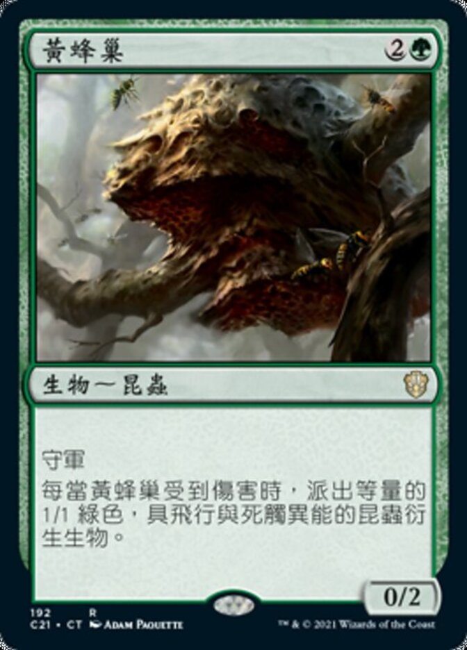 | Rules | Defender (This creature can't attack.) Whenever Hornet Nest is dealt damage, create that many 1/1 green Insect creature tokens with flying and deathtouch. (Any amount of damage a creature with deathtouch deals to a creature is enough to destroy it.) |