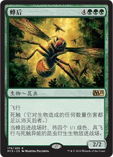 | Rules | Flying Deathtouch (Any amount of damage this deals to a creature is enough to destroy it.) When Hornet Queen enters the battlefield, create four 1/1 green Insect creature tokens with flying and deathtouch. |