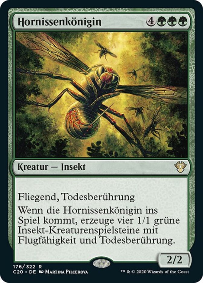 | Rules | Flying Deathtouch (Any amount of damage this deals to a creature is enough to destroy it.) When Hornet Queen enters the battlefield, create four 1/1 green Insect creature tokens with flying and deathtouch. |