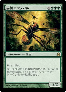 | Rules | Flying Deathtouch (Any amount of damage this deals to a creature is enough to destroy it.) When Hornet Queen enters the battlefield, create four 1/1 green Insect creature tokens with flying and deathtouch. |