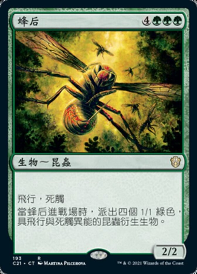 | Rules | Flying Deathtouch (Any amount of damage this deals to a creature is enough to destroy it.) When Hornet Queen enters the battlefield, create four 1/1 green Insect creature tokens with flying and deathtouch. |