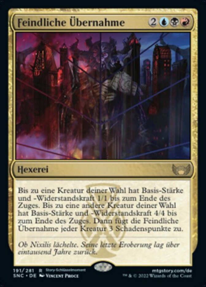 | Rules | Up to one target creature has base power and toughness 1/1 until end of turn. Up to one other target creature has base power and toughness 4/4 until end of turn. Then Hostile Takeover deals 3 damage to each creature. |