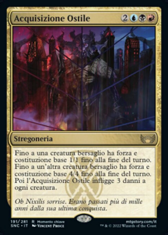 | Rules | Up to one target creature has base power and toughness 1/1 until end of turn. Up to one other target creature has base power and toughness 4/4 until end of turn. Then Hostile Takeover deals 3 damage to each creature. |