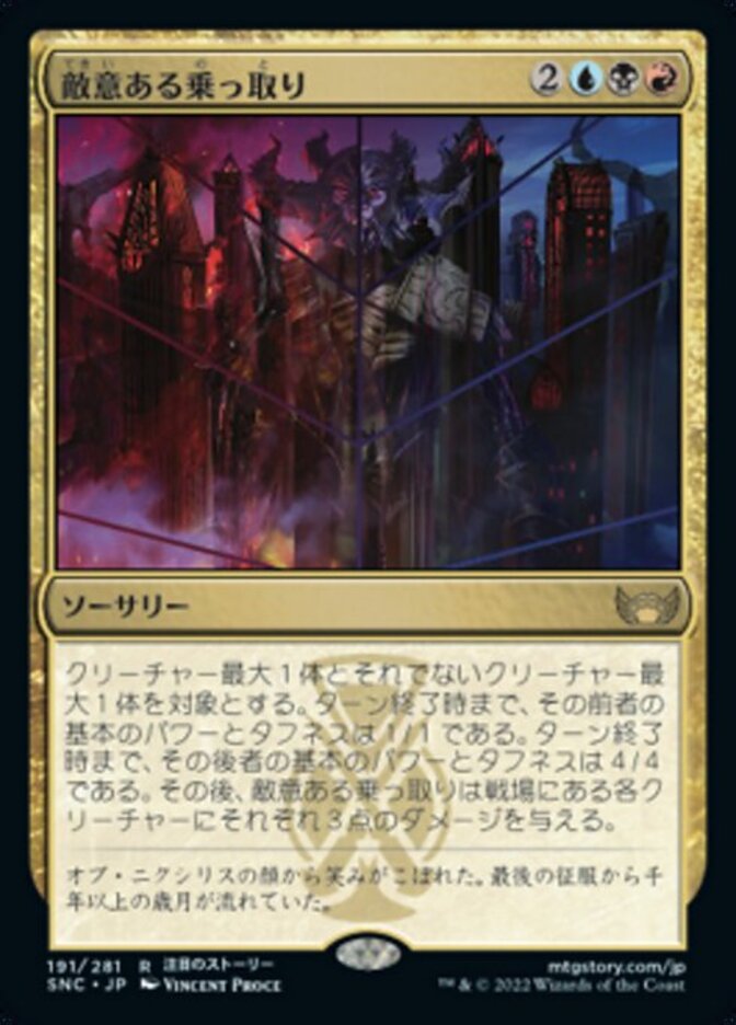 | Rules | Up to one target creature has base power and toughness 1/1 until end of turn. Up to one other target creature has base power and toughness 4/4 until end of turn. Then Hostile Takeover deals 3 damage to each creature. |