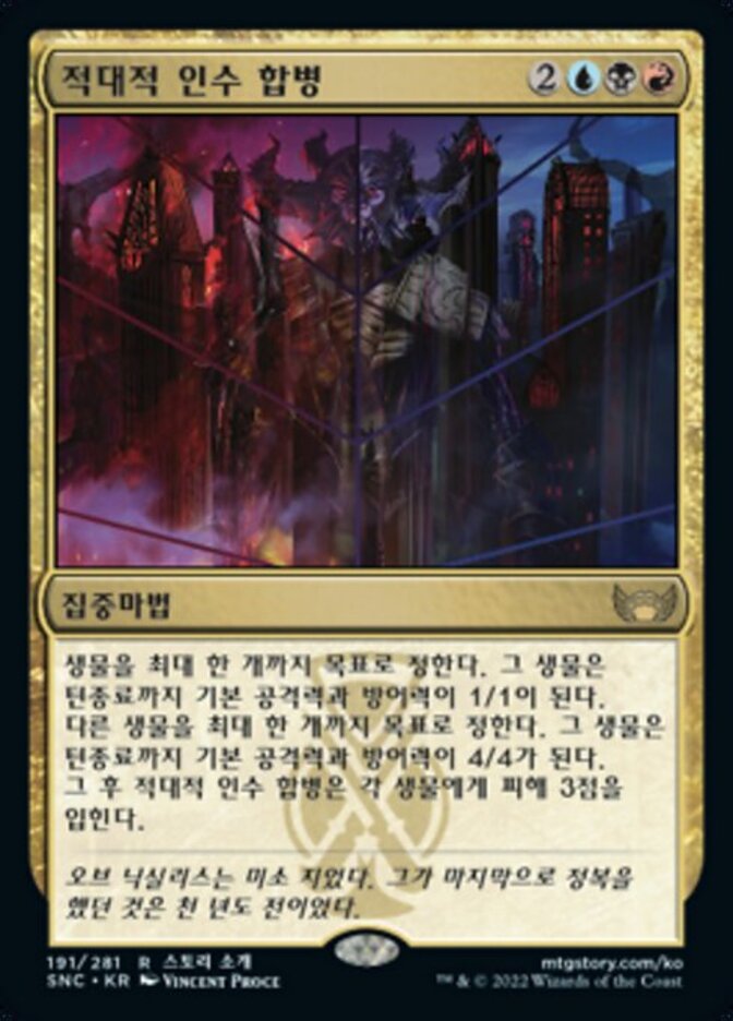 | Rules | Up to one target creature has base power and toughness 1/1 until end of turn. Up to one other target creature has base power and toughness 4/4 until end of turn. Then Hostile Takeover deals 3 damage to each creature. |