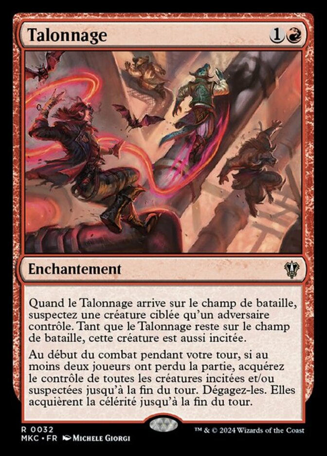 | Rules | When Hot Pursuit enters the battlefield, suspect target creature an opponent controls. As long as Hot Pursuit remains on the battlefield, that creature is also goaded. At the beginning of combat on your turn, if two or more players have lost the game, gain control of all goaded and/or suspected creatures until end of turn. Untap them. They gain haste until end of turn. |