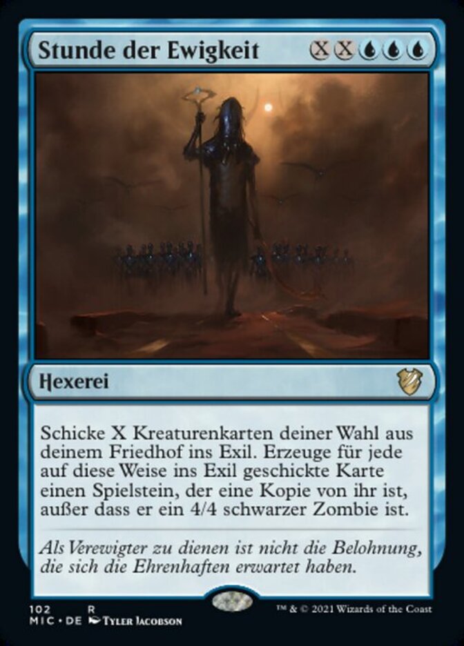 | Rules | Exile X target creature cards from your graveyard. For each card exiled this way, create a token that's a copy of that card, except it's a 4/4 black Zombie. |