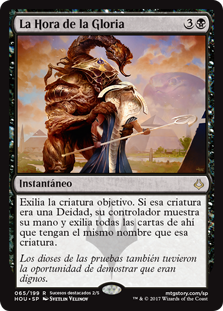 Rules Exile target creature. If that creature was a God, its controller reveals their hand and exiles all cards from it with the same name as that creature.