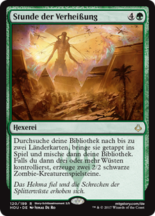 Rules Search your library for up to two land cards, put them onto the battlefield tapped, then shuffle. Then if you control three or more Deserts, create two 2/2 black Zombie creature tokens.