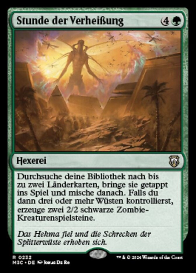 | Rules | Search your library for up to two land cards, put them onto the battlefield tapped, then shuffle. Then if you control three or more Deserts, create two 2/2 black Zombie creature tokens. |