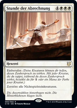 | Rules | Convoke (Your creatures can help cast this spell. Each creature you tap while casting this spell pays for or one mana of that creature's color.) Destroy all nontoken creatures. |