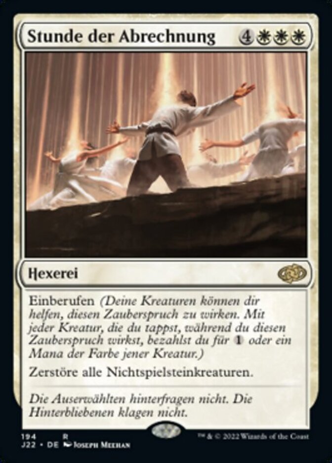 | Rules | Convoke (Your creatures can help cast this spell. Each creature you tap while casting this spell pays for or one mana of that creature's color.) Destroy all nontoken creatures. |