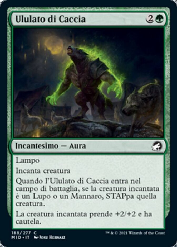 | Rules | Flash Enchant creature When Howl of the Hunt enters the battlefield, if enchanted creature is a Wolf or Werewolf, untap that creature. Enchanted creature gets +2/+2 and has vigilance. |