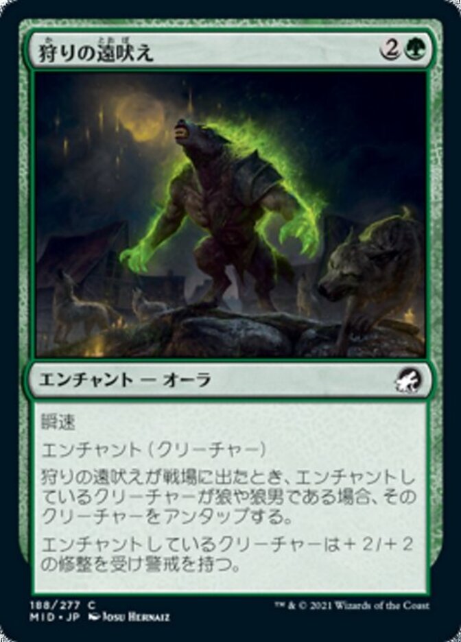 | Rules | Flash Enchant creature When Howl of the Hunt enters the battlefield, if enchanted creature is a Wolf or Werewolf, untap that creature. Enchanted creature gets +2/+2 and has vigilance. |