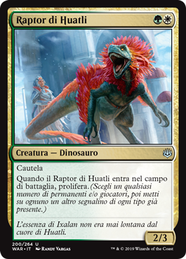 | Rules | Vigilance When Huatli's Raptor enters the battlefield, proliferate. (Choose any number of permanents and/or players, then give each another counter of each kind already there.) |