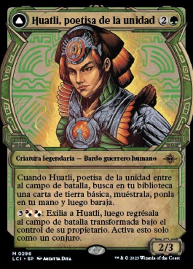 | Rules | When Huatli, Poet of Unity enters the battlefield, search your library for a basic land card, reveal it, put it into your hand, then shuffle. : Exile Huatli, then return her to the battlefield transformed under her owner's control. Activate only as a sorcery. // (As this Saga enters and after your draw step, add a lore counter. Sacrifice after IV.) I — Create two 3/3 green Dinosaur creature tokens. II — Roar of the Fifth People gains "Creatures you control have ': Add , , or .'" III — Search your library for a Dinosaur card, reveal it, put it into your hand, then shuffle. IV — Dinosaurs you control gain double strike and trample until end of turn. |