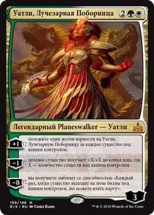 | Rules | +1: Put a loyalty counter on Huatli, Radiant Champion for each creature you control. −1: Target creature gets +X/+X until end of turn, where X is the number of creatures you control. −8: You get an emblem with "Whenever a creature enters the battlefield under your control, you may draw a card." |