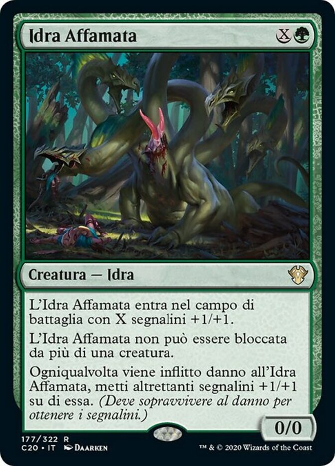 | Rules | Hungering Hydra enters the battlefield with X +1/+1 counters on it. Hungering Hydra can't be blocked by more than one creature. Whenever Hungering Hydra is dealt damage, put that many +1/+1 counters on it. (It must survive the damage to get the counters.) |