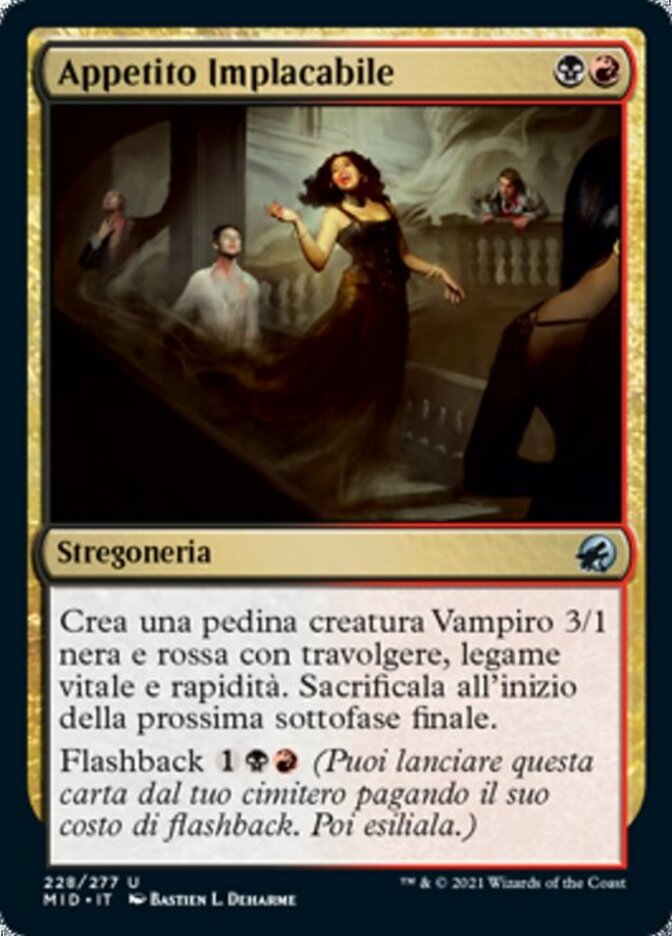 | Rules | Create a 3/1 black and red Vampire creature token with trample, lifelink, and haste. Sacrifice it at the beginning of the next end step. Flashback (You may cast this card from your graveyard for its flashback cost. Then exile it.) |