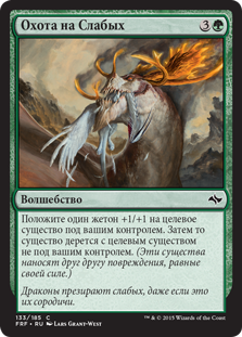 | Rules | Put a +1/+1 counter on target creature you control. Then that creature fights target creature you don't control. (Each deals damage equal to its power to the other.) |