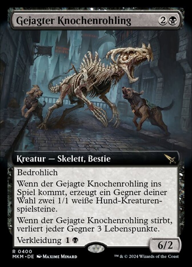 | Rules | Menace When Hunted Bonebrute enters the battlefield, target opponent creates two 1/1 white Dog creature tokens. When Hunted Bonebrute dies, each opponent loses 3 life. Disguise |