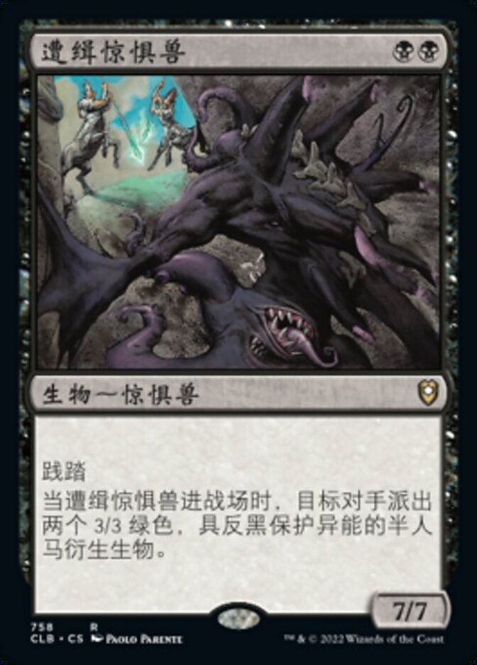 | Rules | Trample When Hunted Horror enters the battlefield, target opponent creates two 3/3 green Centaur creature tokens with protection from black. |