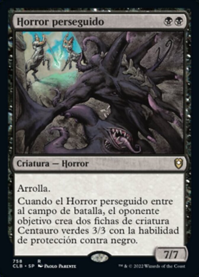 | Rules | Trample When Hunted Horror enters the battlefield, target opponent creates two 3/3 green Centaur creature tokens with protection from black. |