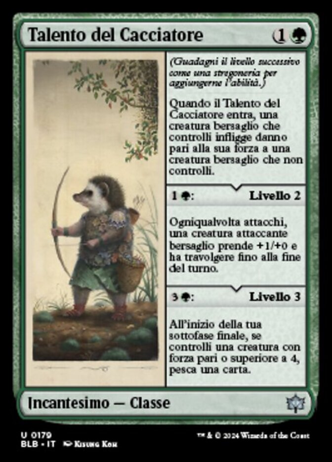 | Rules | (Gain the next level as a sorcery to add its ability.) When Hunter's Talent enters, target creature you control deals damage equal to its power to target creature you don't control. : Level 2 Whenever you attack, target attacking creature gets +1/+0 and gains trample until end of turn. : Level 3 At the beginning of your end step, if you control a creature with power 4 or greater, draw a card. |