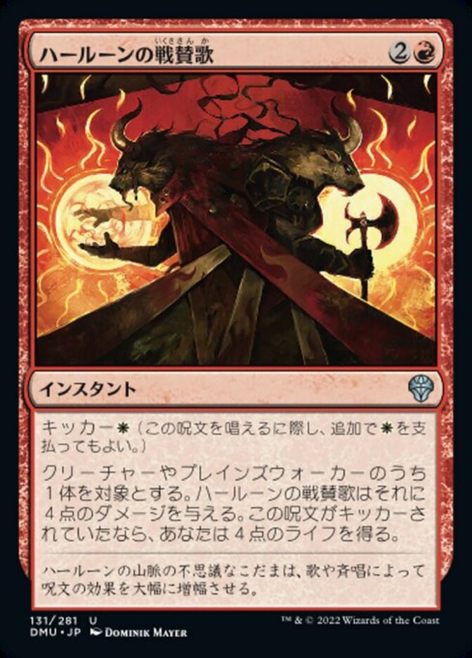 | Rules | Kicker (You may pay an additional as you cast this spell.) Hurloon Battle Hymn deals 4 damage to target creature or planeswalker. If this spell was kicked, you gain 4 life. |
