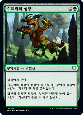 | Rules | Enchant creature When Hydra's Growth enters the battlefield, put a +1/+1 counter on enchanted creature. At the beginning of your upkeep, double the number of +1/+1 counters on enchanted creature. |