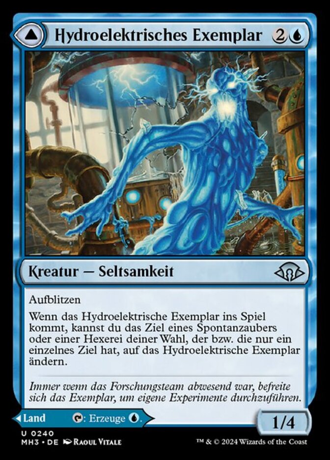| Rules | Flash When Hydroelectric Specimen enters the battlefield, you may change the target of target instant or sorcery spell with a single target to Hydroelectric Specimen. // As Hydroelectric Laboratory enters the battlefield, you may pay 3 life. If you don't, it enters the battlefield tapped. : Add . |
