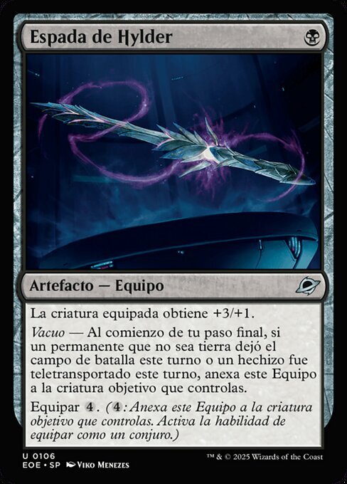 | Rules | Equipped creature gets +3/+1. Void — At the beginning of your end step, if a nonland permanent left the battlefield this turn or a spell was warped this turn, attach this Equipment to target creature you control. Equip (: Attach to target creature you control. Equip only as a sorcery.) |