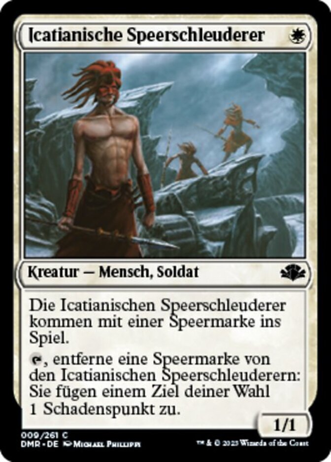 | Rules | Icatian Javelineers enters the battlefield with a javelin counter on it. , Remove a javelin counter from Icatian Javelineers: It deals 1 damage to any target. |