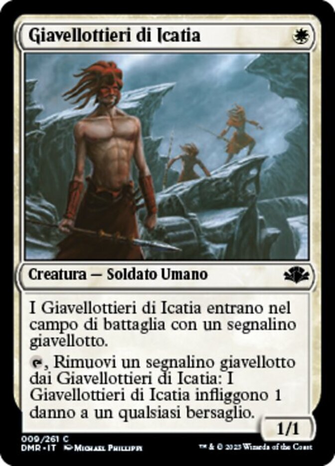 | Rules | Icatian Javelineers enters the battlefield with a javelin counter on it. , Remove a javelin counter from Icatian Javelineers: It deals 1 damage to any target. |